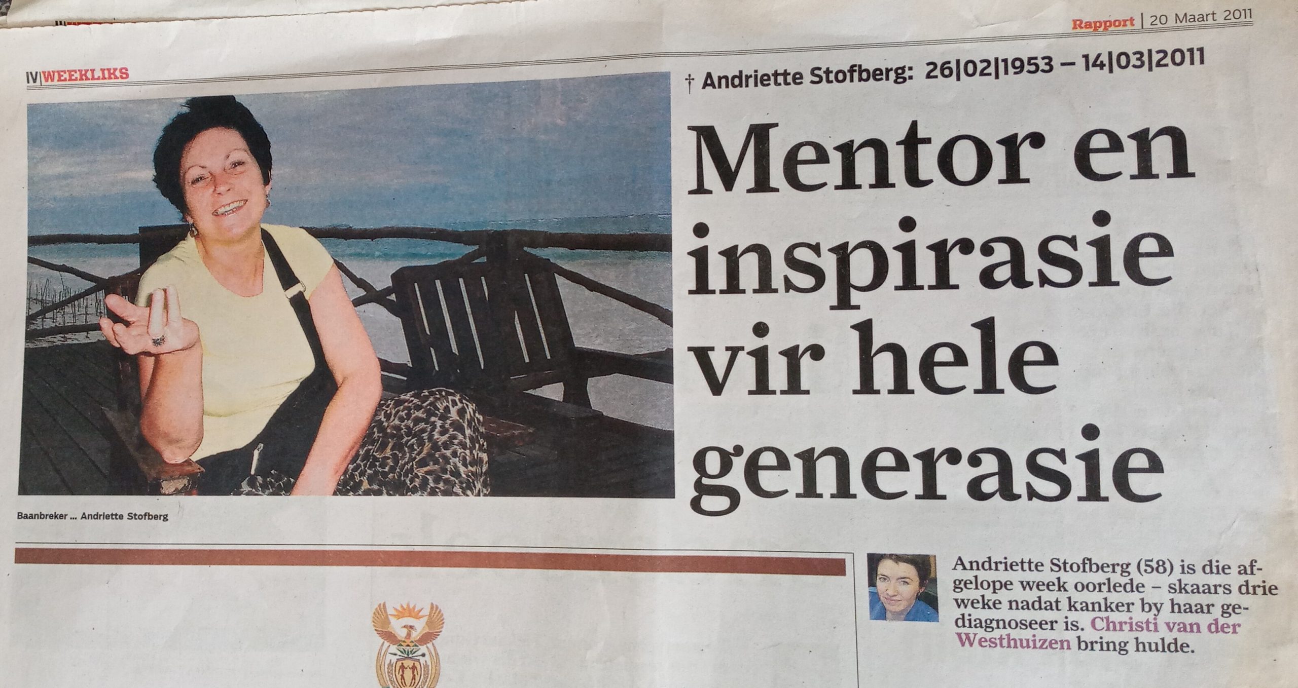 Wanneer ‘n Engelstalige publikasie soos die Sunday Times berig oor die afsterwe van ‘n Afrikaanse joernalis, weet jy dat hy/sy iemand besonders was. So was dit met Andriette Stofberg, ‘n “newsroom legend”, soos die blad se opskrif gelui het.