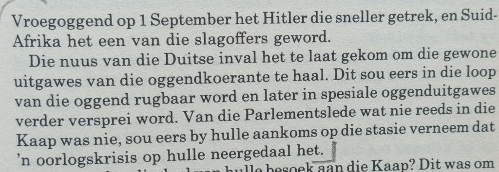 Ná die groot gebeure van 1932-34 volg die volgende groot draaipunt in Suid-Afrika se geskiedenis: Die oorlogskrisis van 1939, wat die koalisie uitmekaar laat spat het en Suid-Afrika kort voor lank ‘n deelnemer aan die oorlog laat word het.