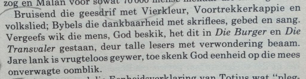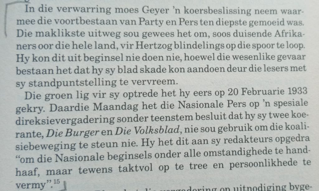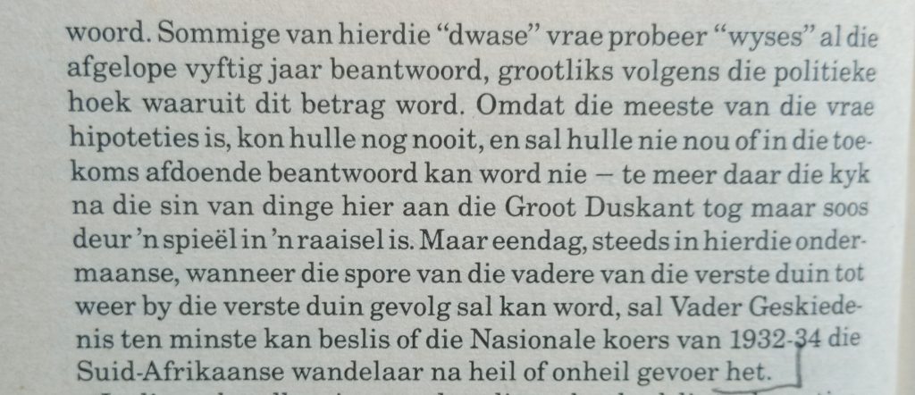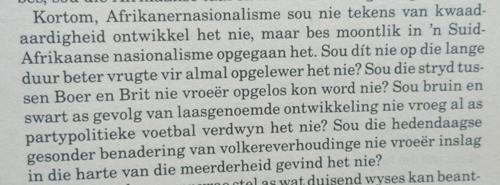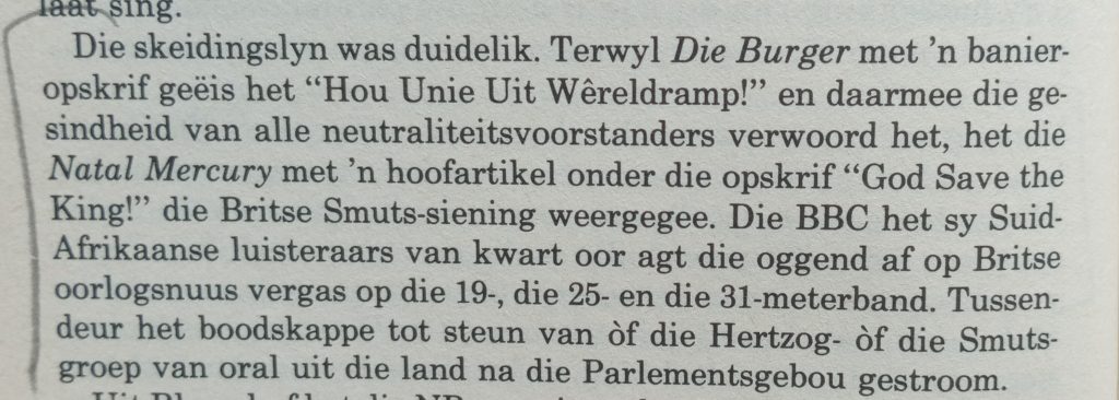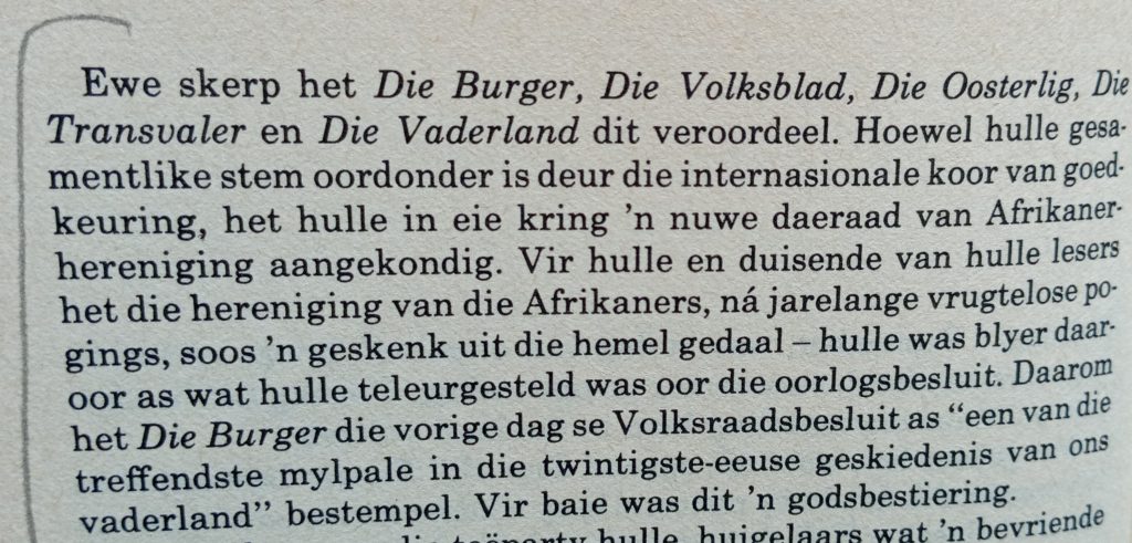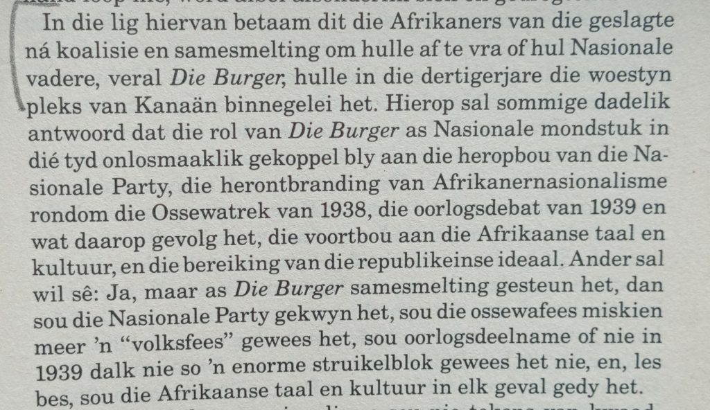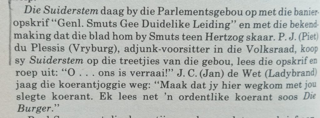 Dit gaan uiteindelik nié bloot om gebeure van meer as 90 jaar gelede nie, hoe vreemd en fassinerend dit ook al mag wees. Uiteindelik kom Van Wyk by die vraag: Wat as Die Burger anders gekies het? Maar kyk eers wat staan op bl. 71 oor ‘n besluit wat te midde van verwarring deur Die Burger se redakteur en direksie geneem moes word: