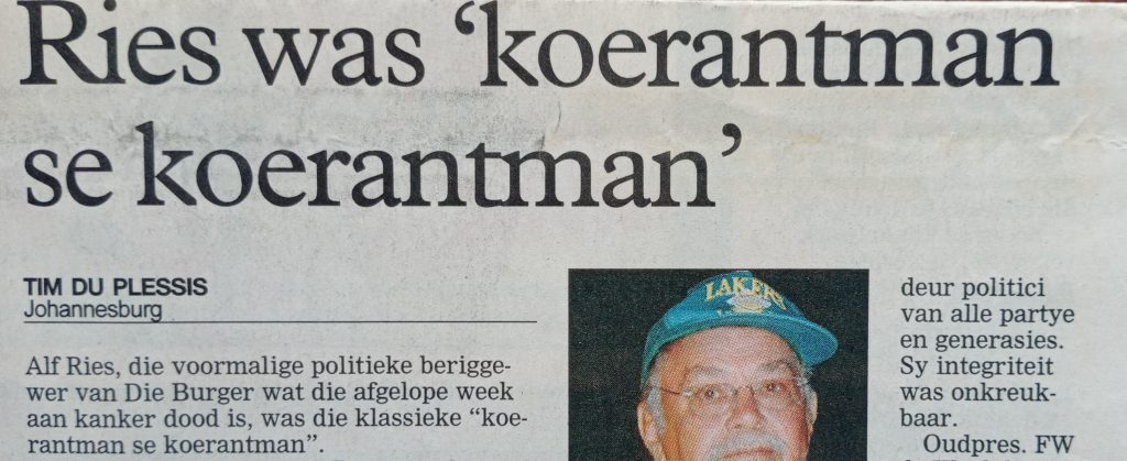 Alf Ries was ‘n assistent-redakteur van Die Burger en politieke redakteur van Nasionale Media wie se naam gereeld bo-aan voorbladhoofberigte in Die Burger gestaan het.