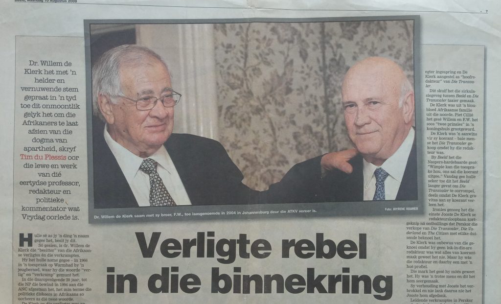 Willem van Heerden is dalk minder bekend, maar was ‘n betekenisvolle figuur in die Afrikaanse joernalistiek van die 20ste eeu. Hy was redakteur van Die Vaderland, voorsitter van Perskor en ook voorsitter van die direksie van Rapport, toe die blad om die helfte deur Perskor en Naspers besit is.