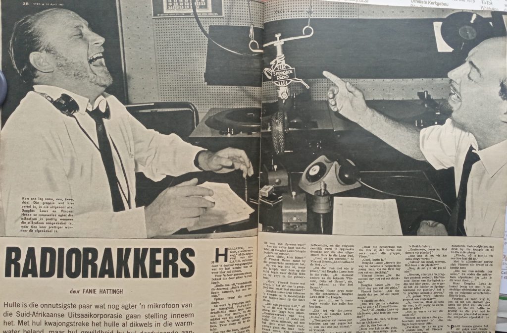 Vincent Hesse was in die gloriejare van Springbokradio ‘n vroegoggendaanbieder saam met Dougie Laws. Springbokradio is in 1950 begin as tweetalige kommersiële stasie wat die Afrikaanse en Engelse dienste moes ondersteun. Hesse het sy radioloopbaan by die Afrikaanse diens van die SAUK begin. Voorheen was hy ‘n akteur in die rondreisende amateurgroep J.A.A.T.S. en klerk by die SAUK. Hy het in ‘n paar rolprente opgetree, onder meer Altyd in jou drome (1952). Onder: Hesse (regs) saam met Laws in die ateljee. Die foto en artikel het in 1967 in die tydskrif Ster verskyn.