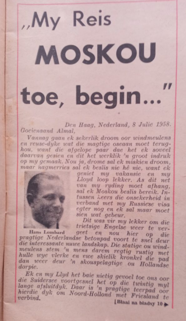 Bo: Hans vertel van sy reis na Moskou toe dit nog ongehoord was. Regs: Die boek wat hy geskryf het nadat hy per straler na die Ooste gevlieg het.