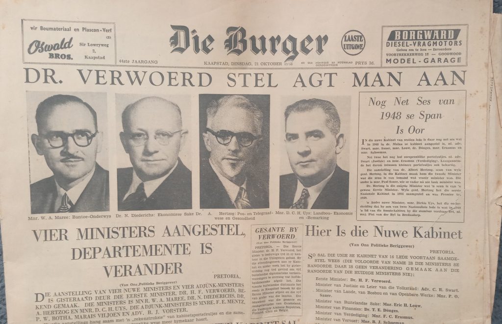 Kabinetsaanstellings was altyd groot nuus in Die Burger. Hierdie voorblad vertel van aanstellings wat dr. H.F. Verwoerd gemaak het. Altesame vier van die mense wat aangestel is, het later staatspresident geword.