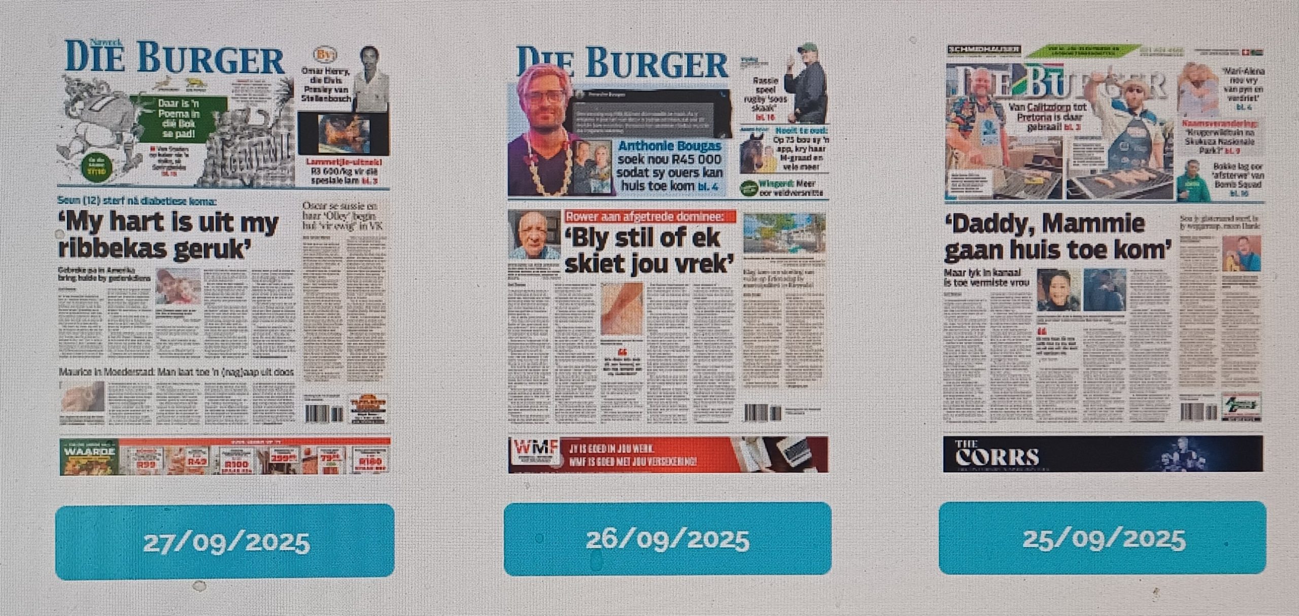 Wat meer as een leser opmerk, is dat Die Burger se voorblaaie meer dikwels lyk soos Son. My artikel in Litnet (https://www.litnet.co.za/is-die-burger-die-nuwe-son/) het hierdie verskynsel reeds in 2024 met vers en kapittel aangetoon. In die jongste tyd word dit daagliks bevestig.