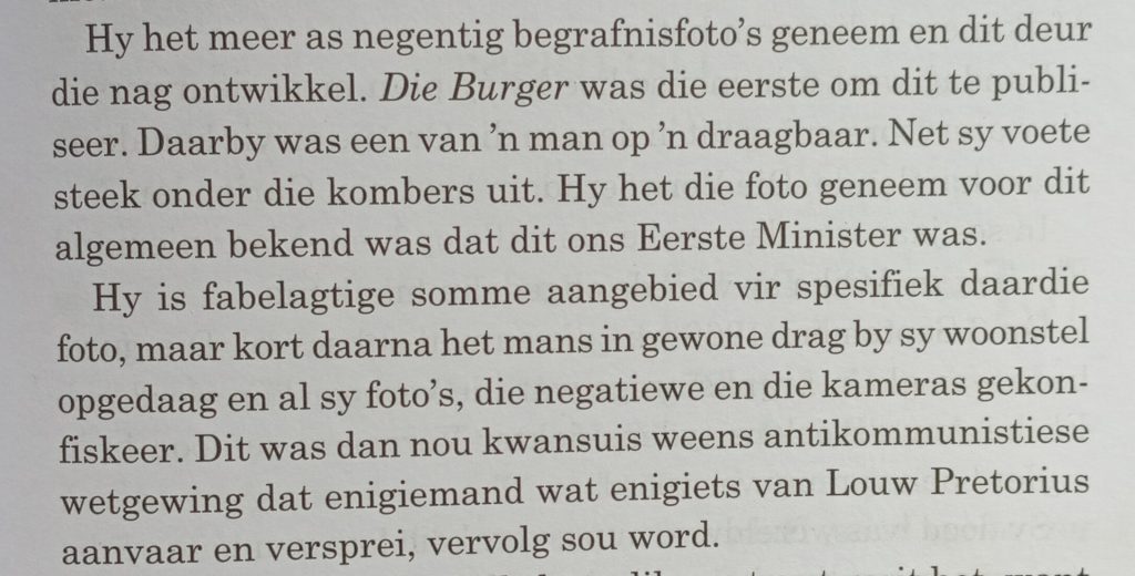 Serfontein se herinneringe aan die media van destyds strek effe verder as haar tydjie by Die Volksblad. Sy vertel hoe die fotograaf Louw Pretorius geteister is weens ‘n foto wat hy van dr. H.F. Verwoerd geneem het toe dié op ‘n draagbaar (vermoedelik) uit die Parlementsgebou gedra is nadat hy dodelik deur ‘n sluipmoordenaar gewond is.