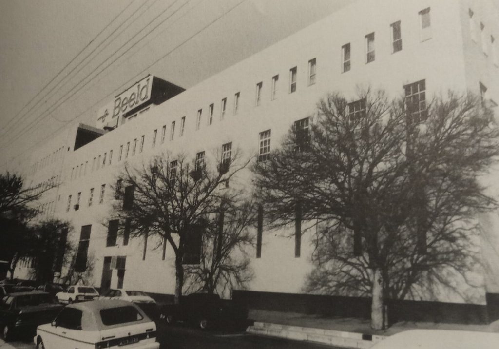 Beeld se gebou in Nieu-Doornfontein/Ellispark was geen pragstuk nie, maar vertoon op hierdie foto netjies. Geld vir indrukwekkende geboue was daar nie. Dit was ‘n meerdoelige gebou wat ook die drukkery in ‘n effe slonserige omgewing moes huisves. Die latere trek na Mediapark was ‘n droom bewaarheid.