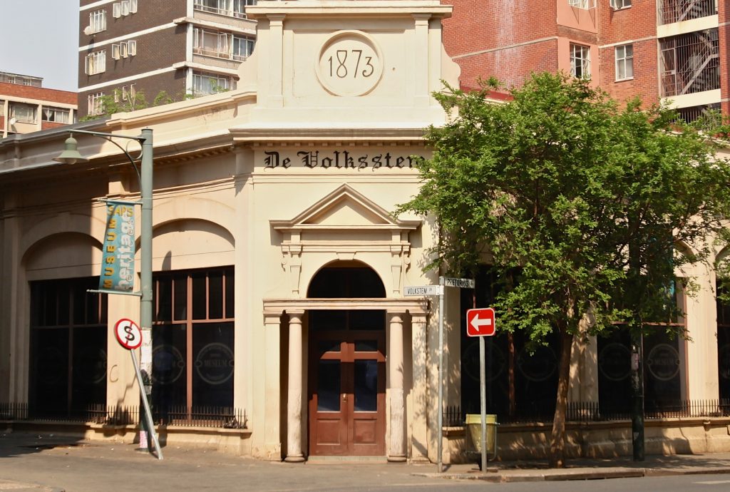 In die noorde was van die eerste koerantkantore heel deftig, ander weer erg beskeie. In hierdie gebou, wat steeds staan, is De Volksstem, later Die Volkstem, saamgestel. (Die blad het tot in 1950 as dagblad bestaan. Foto met erkenning aan Wikipedia. Kyk ook daar vir meer oor hierdie baanbrekerkoerant.)