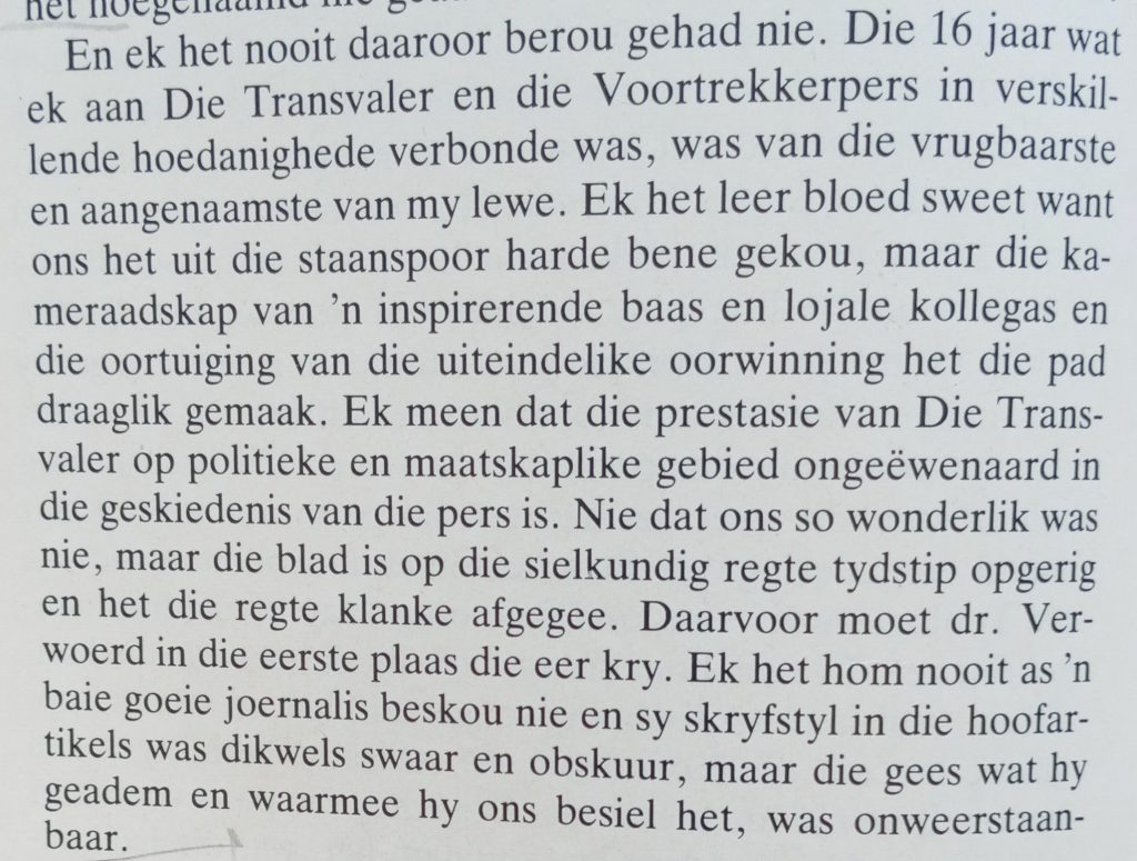 Daarna het hy by Die Volksblad (as sportredakteur) gewerk, waarna hy na Die Burger gegaan het. Dr. H.F. Verwoerd het hom daar vir Die Transvaler gewerf, waar hy die eerste nuusredakteur was. Elk van hierdie dienstydperke kry ‘n hoofstuk. Oor sy weggaan by Die Burger en tyd by Die Transvaler skryf hy onder meer: