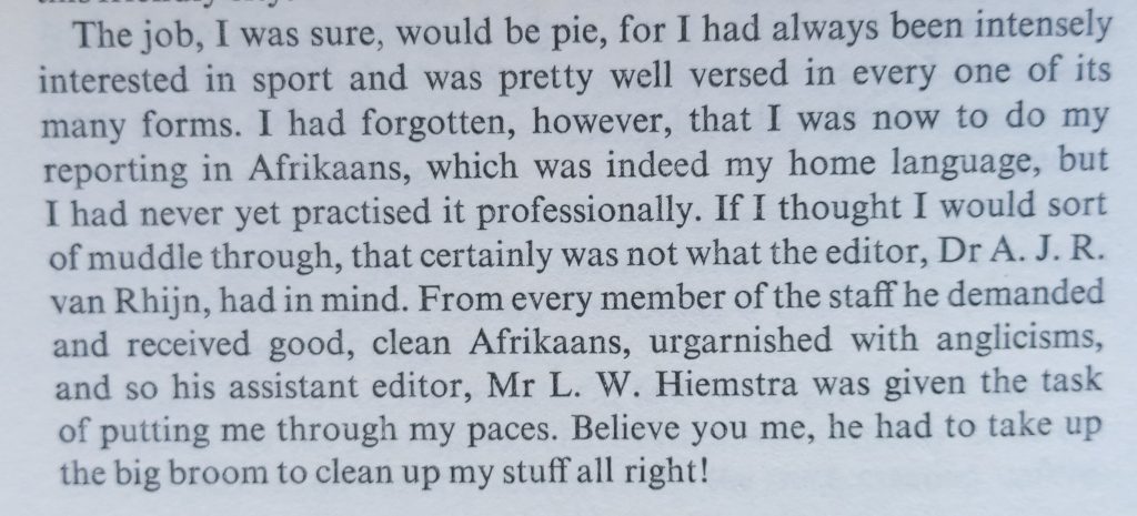 Vir ons is sy werk as joernalis (en kroniekskrywer van joernalistieke geskiedenis) die belangrikste. Hy vertel die volgende oor sy aanstelling as sportredakteur van Die Volksblad: