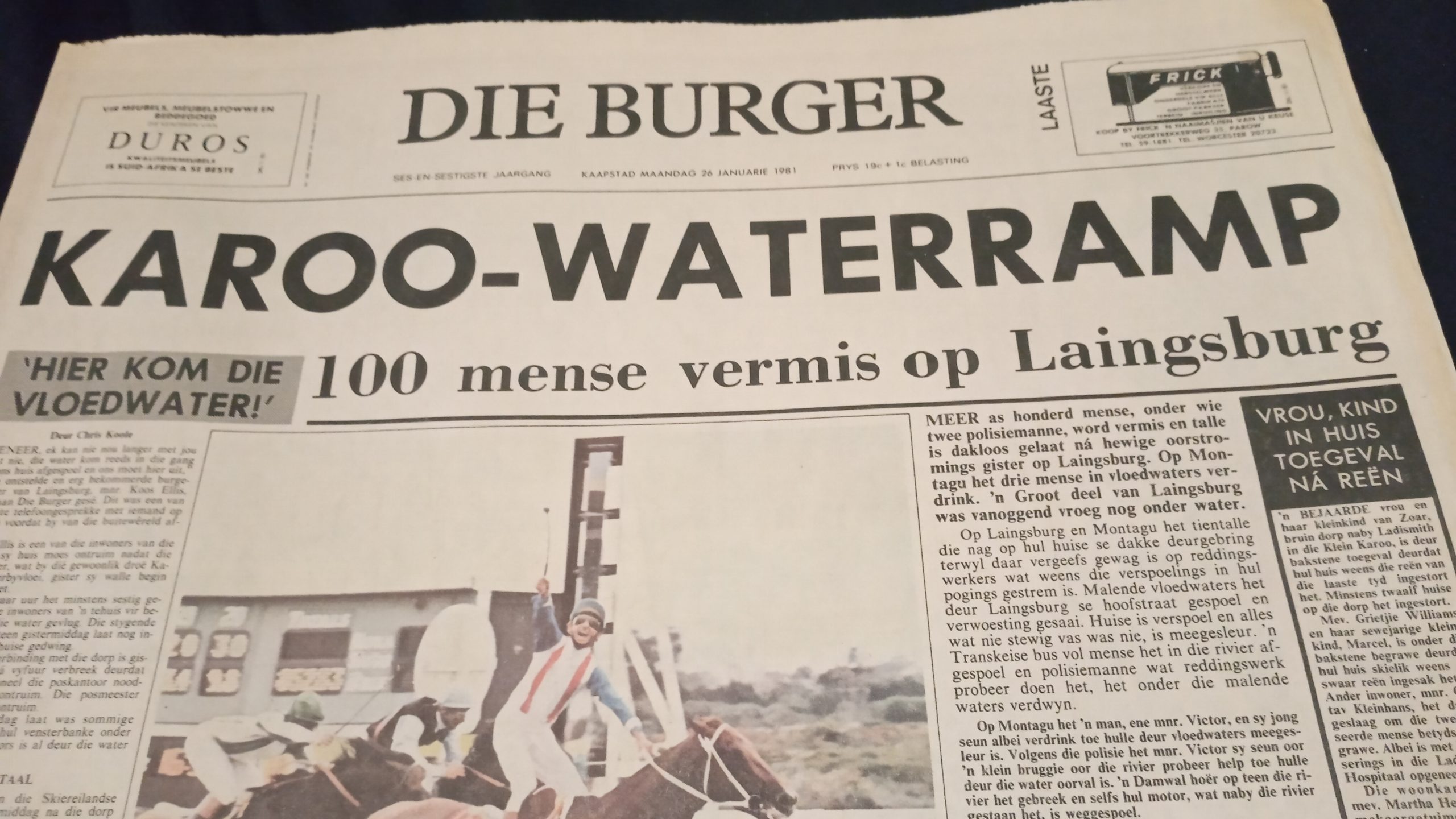 Toe ons die volgende oggend sewenuur huis toe ry, was ons die eerste koerant op straat met foto’s van Tulbagh af waar die aardbewing die ergste skade aangerig en lewensverlies veroorsaak het. Terwyl ek nuusredakteur was, was daar die Laingsburg-vloed. Dit was in die dae voor rekenaars en epos en sulke snelkommunikasiemiddele. Om die stories anderkant die vloedwater te gaan haal, het baie dinkwerk gekos. Om nie te praat van waagmoed nie, want die manne en meisies moes storms en vloedwater trotseer om die nuus by die kantoor te kry. Opwindend was dit beslis, maar ek meen dit het almal van ons binne enkele dae ʼn jaar of vyf ouer laat word.