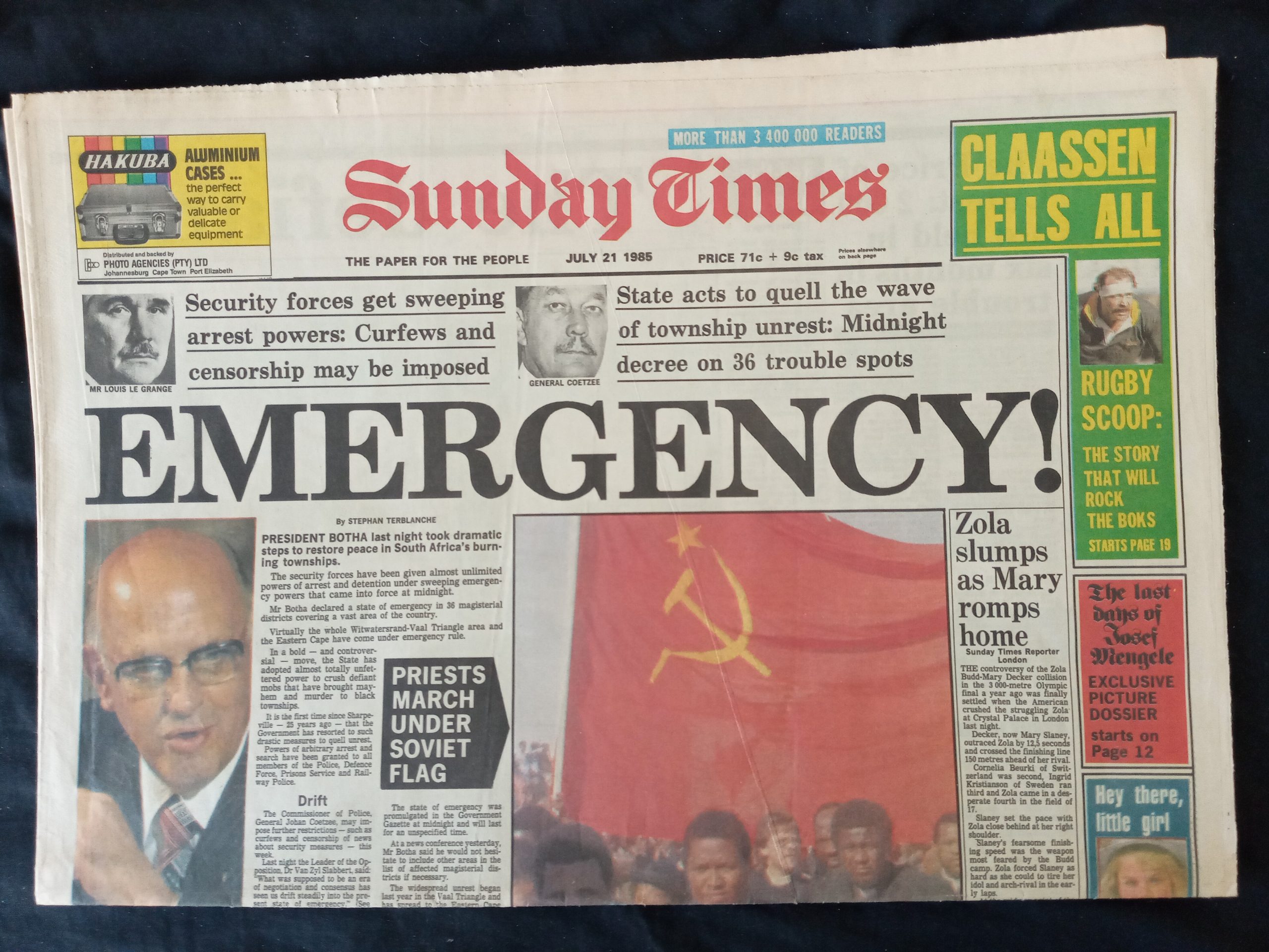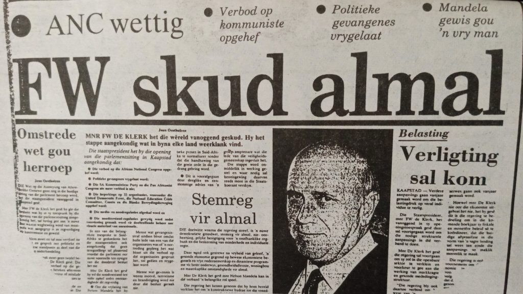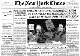 Op 2 Februarie 1990 kondig pres. F.W. de Klerk uit die bloute aan die ANC en ander organisasies ontban word en leiers soos Nelson Mandela vrygelaat word. Dit het dan ook ‘n week later plaasgevind. Die nuus is met wisselende prominensie geplaas, maar het die New York Times gehaal.