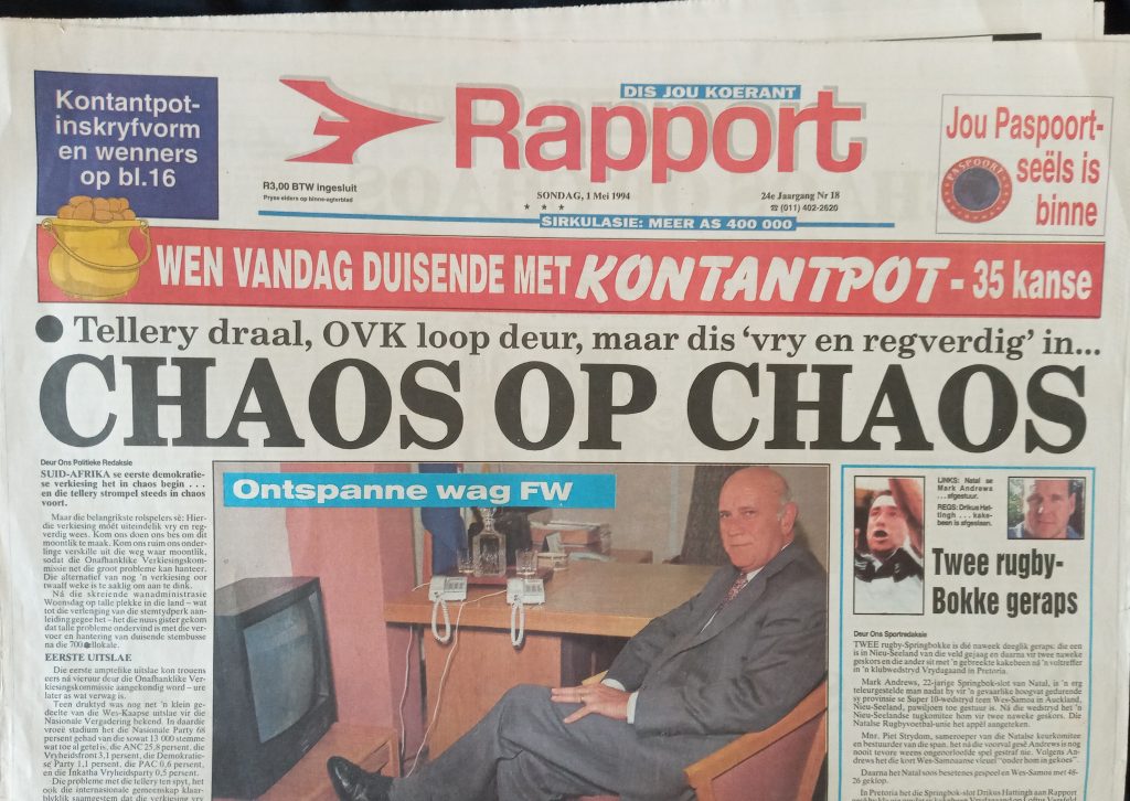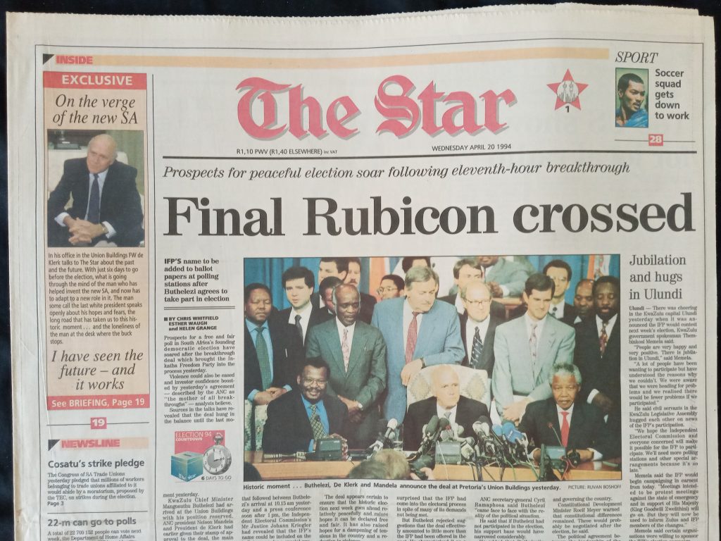 1994: Op die nippertjie het die Inkatha-Vryheidsparty (IVP) tot deelname aan die verkiesing op 26, 27 en 28 April ingestem. The Star bestempel dit as die finale Rubicon, dus die laaste hindernis wat uit die weg geruim is voor die groot verkiesing kon plaasvind.