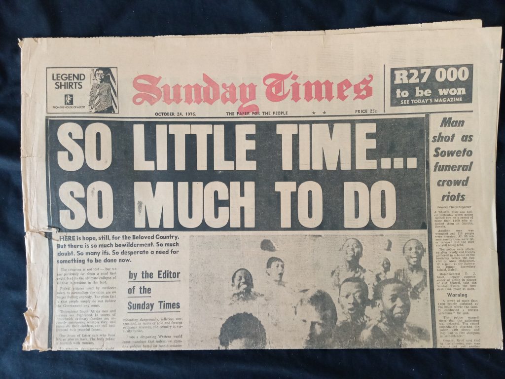 In hierdie tyd (1976) skryf Tertius Myburgh, redakteur van die land se grootste koerant, die Sunday Times, ‘n ongewone voorbladmeningstuk waarin hy pleit vir dramatiese veranderinge wat die land sal wegstuur van die afgrond.