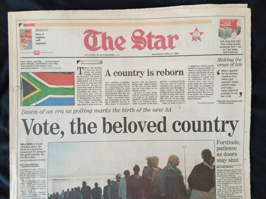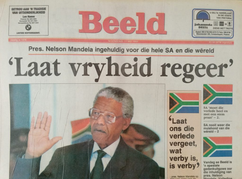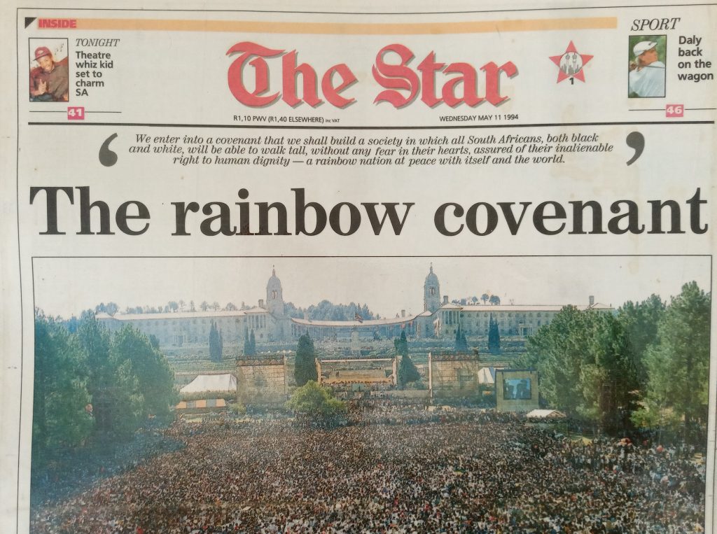 Die ANC het met ‘n groot meerderheid gewen, Nelson Mandela is in die Parlement tot president verkies en die volgende dag, 11 Mei 1994, word president Mandela voor ‘n skare by die Uniegebou in Pretoria ingehuldig. The Star se opskrif dui op ‘n gelofte wat die reënboognasie met mekaar sluit. Die jare wat volg, vertel sy eie storie.