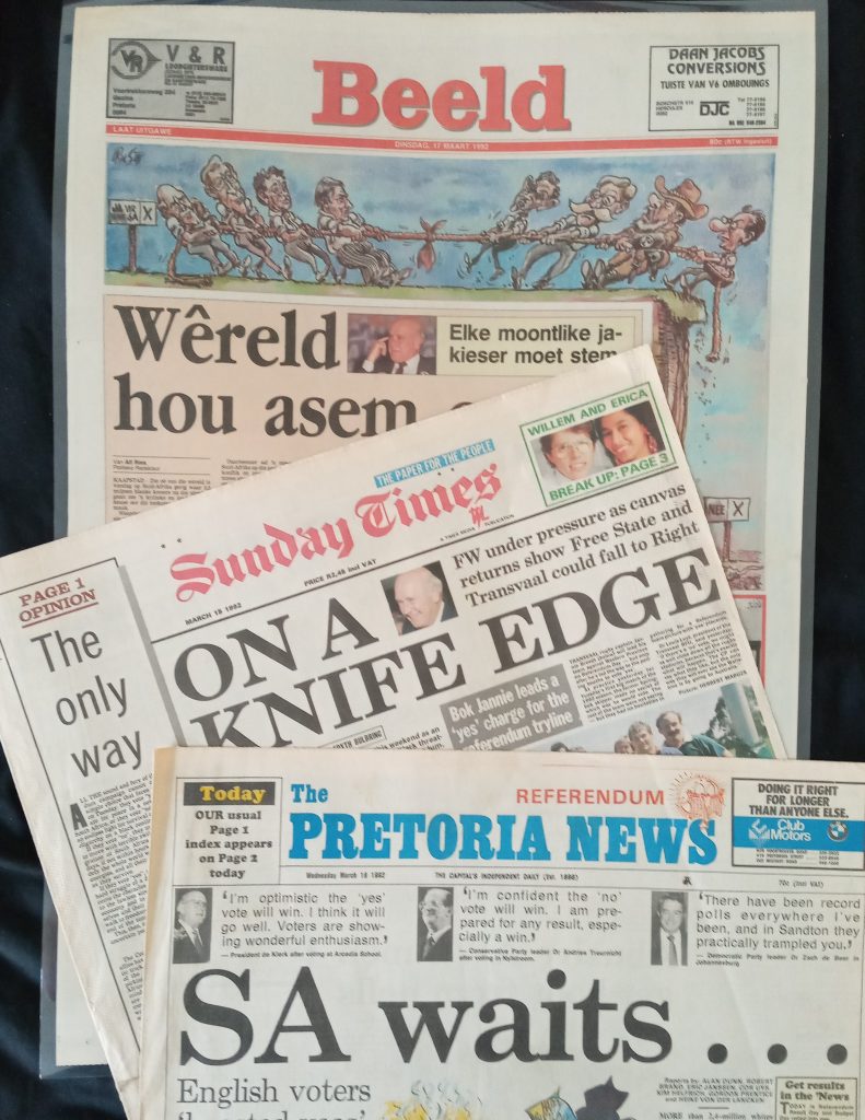 Die volgende belangrike stap was om die blanke kiesers in ‘n referendum te vra om die onderhandelingsproses te steun. As die nee-stem sou wen, sou die hele proses van die baan wees. Pres. F.W. de Klerk het ‘n mandaat gevra en die land het dus in Maart 1992 asem opgehou.