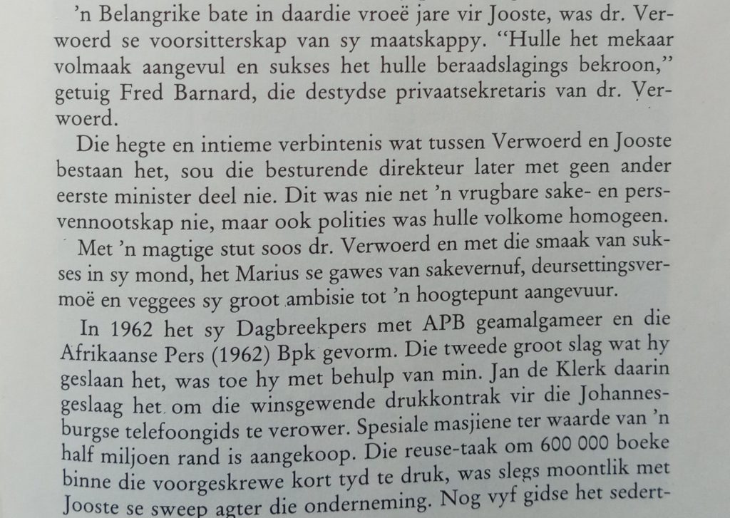 Maar die boek is ook ‘n geskiedenis van persmaatskappye en daarom moet ons die draad volg: die Noordelike Drukpers Maatskappy is in 1932 deur Afrikaanse Pers Bpk. vervang en het Ons Vaderland as Die Vaderland voortgesit. Jare later, in 1962, smelt Die Afrikaanse Pers Bpk. saam met Dagbreekpers en word die maatskappy Die Afrikaanse Pers (1962) Beperk gestig met Marius Jooste as besturende direkteur en dr. H.F. Verwoerd as voorsitter. Die “1962” was ‘n histories belangrike deel van die nuwe naam.