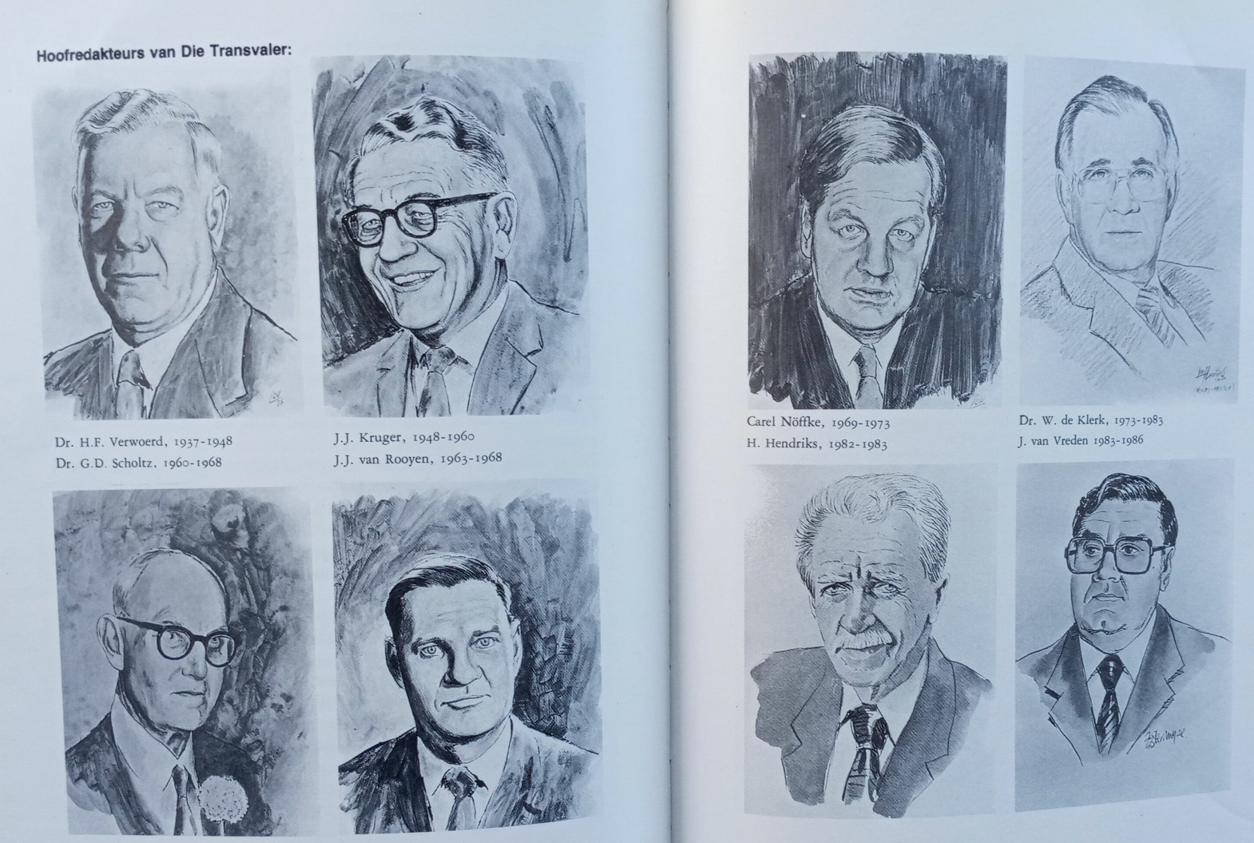 Foto heel bo: Die Transvaler se hoofredakteurs, uitgesluit die laaste twee: dr. Gerrit Velthuysen en Gerhard Burger. Die sketse kom uit die boek Die Transvaler 50 jaar en is gedoen deur Lou Henning. Meer oor die boek by die afdeling Boeke.