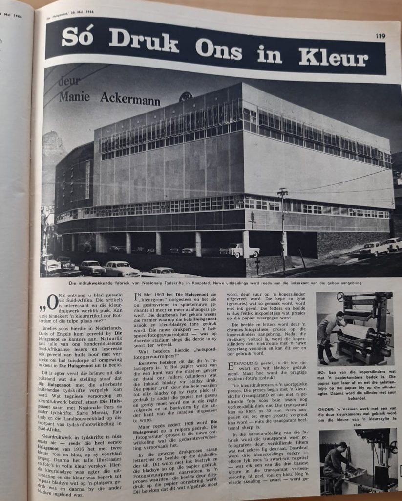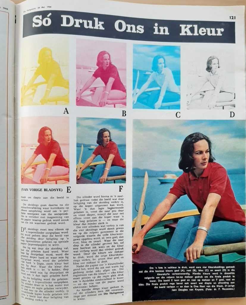 Reeds in 1966 het Die Huisgenoot en ander tydskrifte in volkleur begin druk. Hier wys die blad aan lesers hoe ‘n kleurbladsy gedruk word. Geel, blou, pienk (magenta) en swart is ter sprake. Die eerste drie kleure bo-oor mekaar gedruk kan enige kleur produseer, na gelang van die persentasie geel, blou of magenta. So gee magenta en geel bo-op mekaar natuurlik rooi, ensovoorts. Die swart is gewoonlik net vir die teks. Die sleutel tot goeie drukwerk is dat elke plaat se kleur presies op mekaar pas (registreer).
