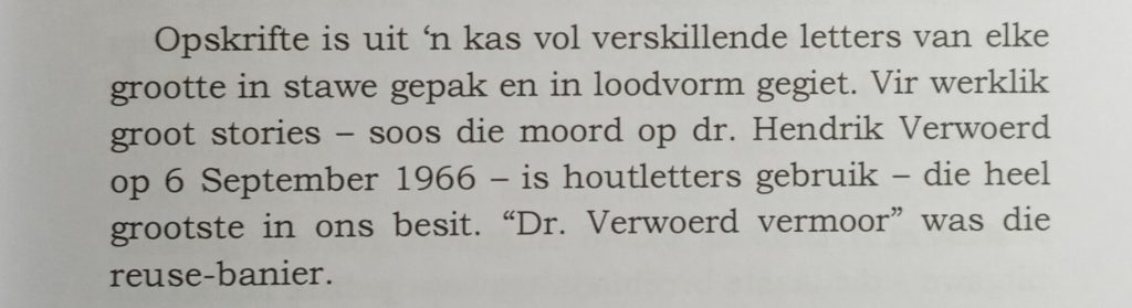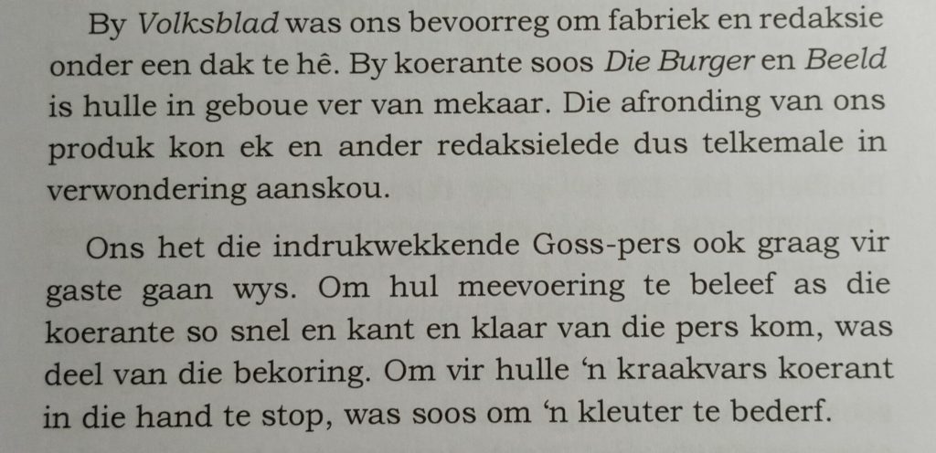 Nog later het ek die manne in die settery leer ken. Oom Manie, soos ons hom genoem het, was die kop-setter. As jy die aand gesub het en die kop wat jy deurgestuur het settery toe kom terug na jou toe met ‘n aantekening “TL” daarop, moes jy weet, dit was te lank, oom Manie kon dit nie set nie. Dan probeer jy dit korter maak en stuur dit weer. As dit dan weer terugkom met ”NTL” daarop, moes jy weet, dis ”Nog te Lank”.