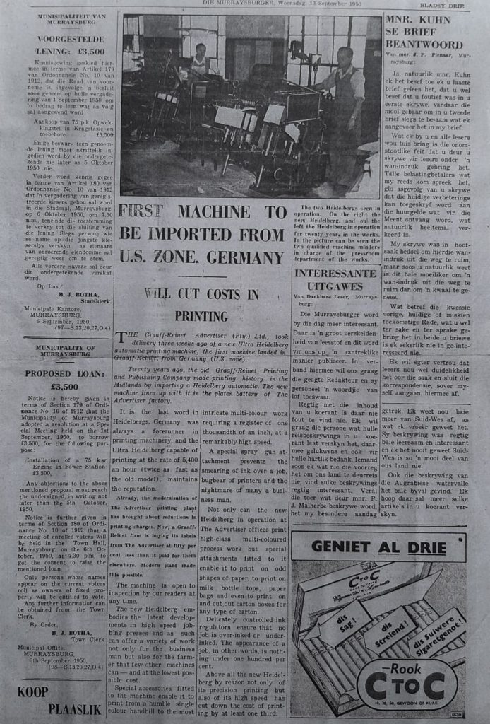 So was dit ook in die Karoo toe ‘n nuwe drukpers wat op Graaff-Reinet geïnstalleer is en waarop verskeie koerante, insluitende Die Murraysburger, gedruk is. Later is baie plaaslike koerante sentraal op George, in die Paarl of Johannesburg gedruk en dan aangery.