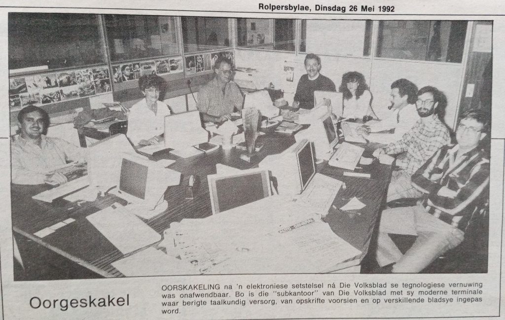 By Die Volksblad het eers in 1992 na ‘n elektroniese setstelsel oorgeskakel. Hier is die subs (subredakteurs) in die subkantoor agter hul nuwe rekenaars.
