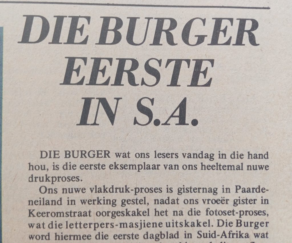Die Burger kondig in 1973 aan dat hy die eerste koerant in Suid-Afrika is wat die ou setproses vervang het met die nuwe.
