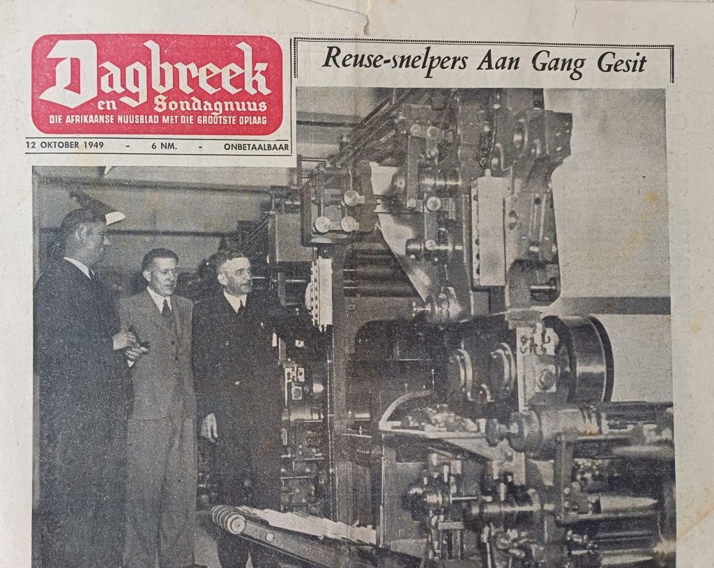 In 1949 brand Dagbreek, die eerste Afrikaanse Sondagblad, se drukkery af, maar agttien maande later staan hierdie rolpers in ‘n nuwe gebou. Die mense op die foto is Marius Jooste (besturende direkteur), prof. L.J. du Plessis (voorsitter van Dagbreekpers se direksie) en nog ‘n direkteur, F.S. Steyn.