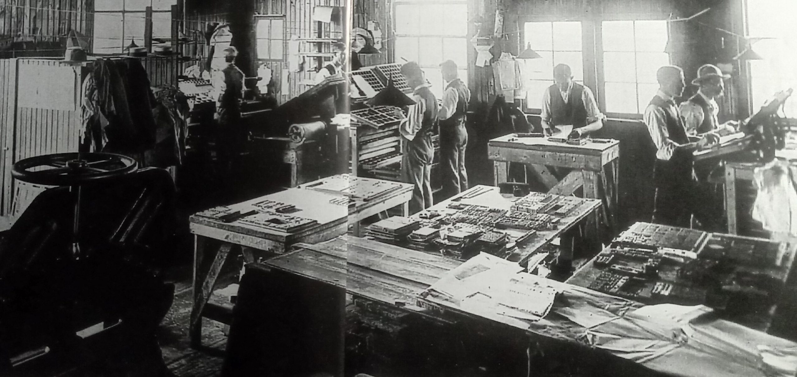 Hooffoto bo: Die settery vroeg in die 20ste eeu by Het Westen, wat metterwyl van Potchefstroom na Bloemfontein geskuif het. Die blad se naam is eers na Het Volksblad verander, daarna na Die Volksblad (as deel van Nasionale Pers, vandag Naspers met Media24 as filiaal) en eindelik bloot Volksblad. Let op die tafels vol loodletters en die drukkerslaaie links waarin letters gepak is. Met erkenning aan ‘n Lewe van sy eie, Leo Barnard en Jan-Ad Stemmet se biografie van Volksblad, in die koerant se eeufeesjaar, 2004, deur Tafelberg uitgegee. (Kyk ook artikel oor Volksblad in die afdeling Koerante.)