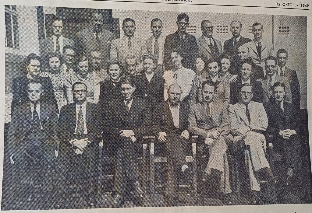 Dagbreek se personeel (redaksie, administrasie, advertensie-afdeling en tegniese mense) in 1949. Voor in die middel (met bles en strikdas) is Willem van Heerden (hoofredakteur en later voorsitter van Rapport). Links van hom is Marius Jooste (besturende direkteur en later die dryfkrag agter Perskor). Regs van Van Heerden sit Otto Schwellnus (assistent-hoofredakteur), die politieke korespondent, dr. Piet Meyer (in ligte pak) en Dirk Richard (nuusredakteur en later hoofredakteur van Dagbreek asook Vaderland).