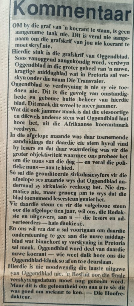 Die buitengewone voorbladkommentaar wat Thys Human geskryf het by die aankondiging dat Oggendblad van die mark gaan verdwyn. Dit was die gevolg van die knoeiery met sirkulasiesyfers by die Transvaler en die verdeling van die Afrikaanse koerantmark tussen Naspers en Perskor. Ingevolge daarvan het Beeld die oggendmark gekry en die Transvaler het na die middagmark geskuif. Na ‘n tyd as Pretoriase middagkoerant, het die Transvaler ook gesluit, die laaste van Perskor se Afrikaanse dagblaaie.