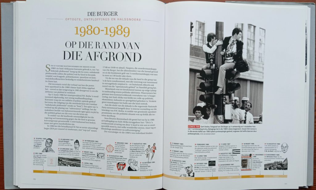 Van die beste koerantfoto’s ooit is te sien en ‘n hele aantal spotprente wat deur Die Burger se D.C. Boonzaier, T.O. Honiball en Fred Mouton geteken is. Voorblaaie van groot stories is uitgesoek en plaas die fokus op dit waarom dit uiteindelik gegaan het: die oordra van die nuus wat vir Die Burger se eens legendaries getroue lesers van belang was.