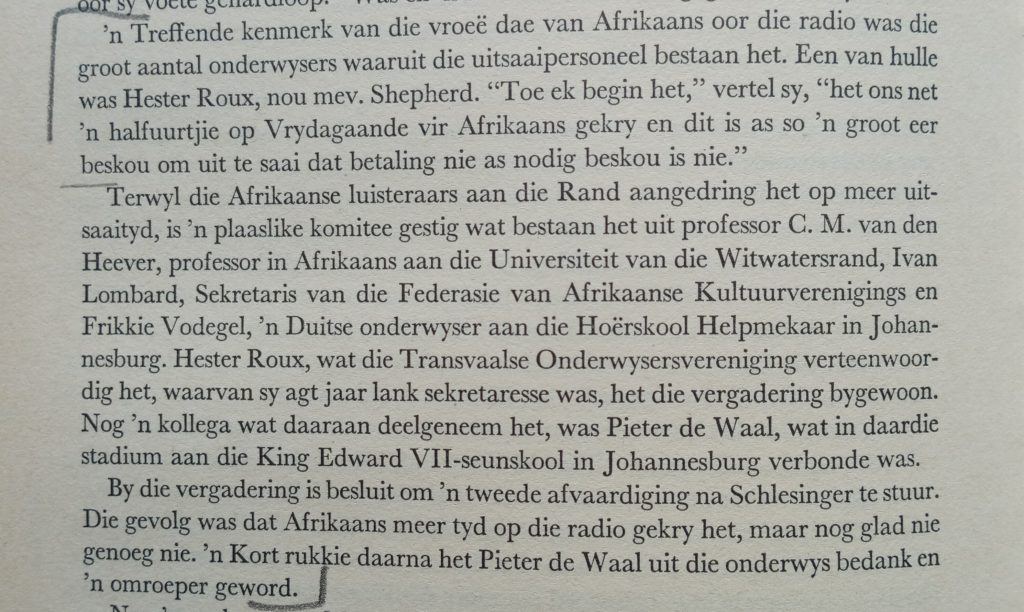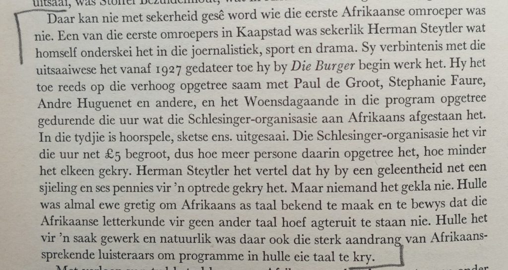 Rosenthal gee in ‘n hoofstuk spesifieke aandag aan Afrikaanse radio in hierdie vroeë jare. Daarin kom pioniere soos Herman Steytler, M.P.O. Burgers en Pieter de Waal se name ook voor.