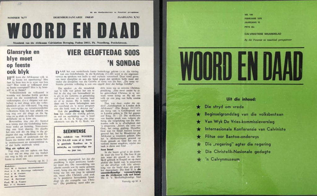 De Klerk, P. 2000. Die tydskrif Woord en Daad en die apartheidsbeleid, 1954-1966. (Joernaal vir Eietydse Geskiedenis, Vol. 25(1)).